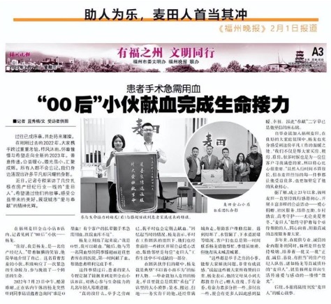報(bào)道中的主人公,是來自福州麥田房產(chǎn)金山中心區(qū) 金山小店B店的楊龍。2022年7月,這位00后小伙,當(dāng)?shù)弥獦I(yè)主的家人在醫(yī)院急需獻(xiàn)血,他和店里的另一名伙伴滕超麗第一時(shí)間響應(yīng),前往醫(yī)院義務(wù)獻(xiàn)血,收獲了業(yè)主家人的由衷感謝:“是你們救了我母親的生命”。