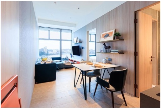 房間設(shè)計(jì)風(fēng)格以自然原木為主基調(diào),整體色調(diào)柔軟而溫暖,色彩靈感來(lái)自充滿活力而又溫馨的西九:坐擁西九貨運(yùn)、藝術(shù)及文化樞紐的獨(dú)特位置,希望為途經(jīng)的精英人士營(yíng)造溫馨如家的感覺。房間空間貫通,視野開闊。餐臺(tái)和書桌的連貫設(shè)計(jì)提升了柜臺(tái)空間利用率,可折疊的沙發(fā)組合亦滿足白領(lǐng)精英于家中聚會(huì)交友的靈活需求。為充分利用特高樓底帶來(lái)的高采光度優(yōu)勢(shì),每間房的景觀落地窗都經(jīng)由細(xì)致規(guī)劃,將窗外風(fēng)光引入家中室內(nèi),提升全屋景觀。