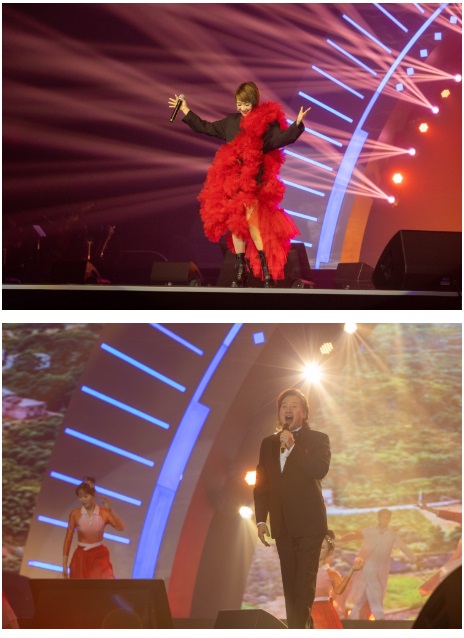 隨后,在萬(wàn)眾期待下,知名歌手陳慧嫻登場(chǎng),為大家?guī)?lái)了《飄雪》《千千闕歌》等六首經(jīng)典金曲;知名歌手葉倩文現(xiàn)場(chǎng)深情演唱了《瀟灑走一回》《祝!;知名歌手林子祥則動(dòng)情演唱了《男兒當(dāng)自強(qiáng)》和《誰(shuí)能明白我》兩首經(jīng)典曲目;知名歌唱家戴玉強(qiáng)現(xiàn)場(chǎng)演唱了《草原上升起不落的太陽(yáng)》《我的太陽(yáng)》《我和我的祖國(guó)》三首歌曲。一首首廣為大眾所熟悉和喜愛(ài)的經(jīng)典名曲與重磅明星們動(dòng)人心扉的歌聲,為現(xiàn)場(chǎng)觀眾提供了極致的視聽(tīng)享受,讓在場(chǎng)所有人為之沉醉。