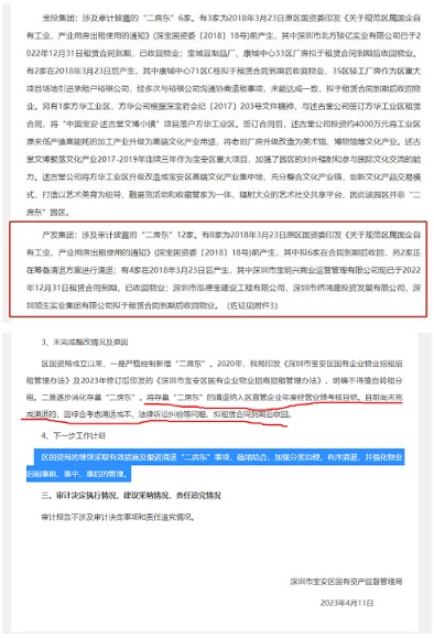 產(chǎn)發(fā)集團(tuán)涉及審計(jì)披露的“二房東”12家。有8家為2018年3月23日原區(qū)國(guó)資委印發(fā)《關(guān)于規(guī)范區(qū)屬國(guó)企自有工業(yè)、產(chǎn)業(yè)用房出租使用的通知》(深寶國(guó)資委〔2018〕18號(hào))前產(chǎn)生,其中擬6家在合同到期后收回,另2家正在籌備清退方案進(jìn)行清退;有4家在2018年3月23日后產(chǎn)生,其中深圳市寶明興商業(yè)運(yùn)營(yíng)管理有限公司現(xiàn)已于2022年12月31日租賃合同到期,已收回物業(yè);深圳市泓德寶建設(shè)工程有限公司、深圳市僑鴻盛投資發(fā)展有限公司、深圳旭生實(shí)業(yè)集團(tuán)有限公司擬于租賃合同到期后收回物業(yè)。