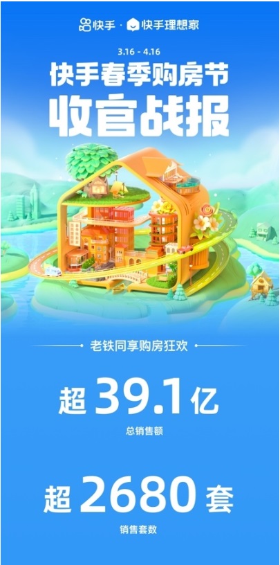 在各地利好政策的推動下,房地產市場逐步回溫,直播短視頻房產知識與信息平臺和房產交易服務平臺快手理想家也為復蘇注入了新動力。近日,快手理想家春季購房節(jié)圓滿收官,活動吸引了超650萬人參加,總銷售額超39.1億,引爆48個城市的超690個樓盤,總銷售套數(shù)超2680套。