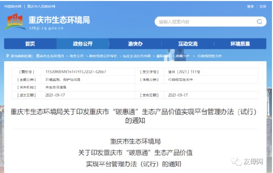圖 1 重慶市生態(tài)環(huán)境局關(guān)于印發(fā)重慶市“碳惠通”生態(tài)產(chǎn)品價(jià)值實(shí)現(xiàn)平臺(tái)管理辦法 (試行)的通知