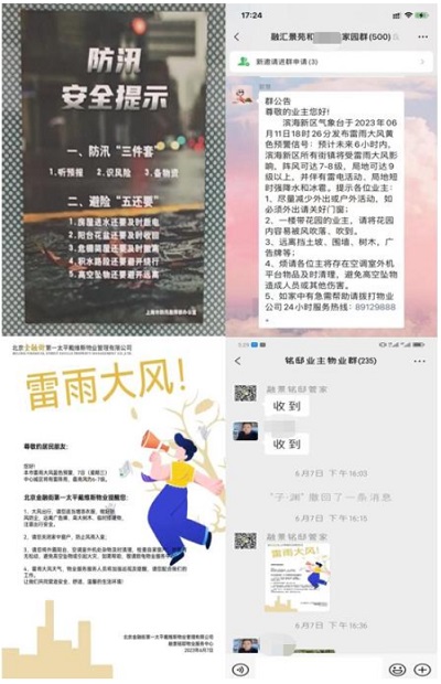 客服管家時(shí)刻關(guān)注當(dāng)?shù)貧庀蟛块T預(yù)警信息,通過(guò)業(yè)主微信群、公告欄、電梯前示等形式提前向業(yè)主發(fā)布溫馨提醒,同時(shí)加強(qiáng)項(xiàng)目空置房巡查,細(xì)致的貼心服務(wù)深受業(yè)主好評(píng)。