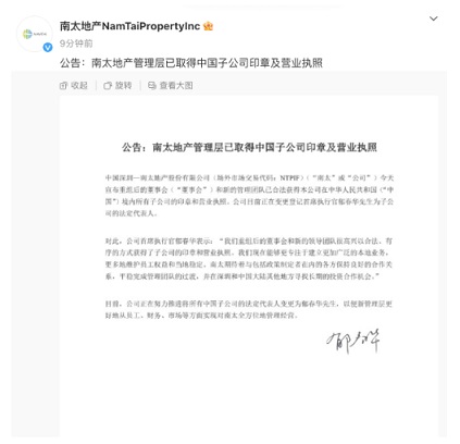 這一重大進(jìn)展標(biāo)志著南太地產(chǎn)即將結(jié)束長(zhǎng)期的糾紛,步入正軌。公告中南太地產(chǎn)CEO郁春華表示:“我們重組后的董事會(huì)和新的領(lǐng)導(dǎo)團(tuán)隊(duì)很高興以合法、有序的方式獲得了子公司的印章和營(yíng)業(yè)執(zhí)照。我們現(xiàn)在能夠更專注于建立更加廣泛的本地業(yè)務(wù),更多地維護(hù)員工權(quán)益和當(dāng)?shù)胤(wěn)定。南太期待著與包括政策制定者在內(nèi)的各方保持良好的合作關(guān)系,平穩(wěn)完成管理團(tuán)隊(duì)的過渡,并在深圳和中國(guó)大陸其他地方尋找長(zhǎng)期的投資合作機(jī)會(huì)!