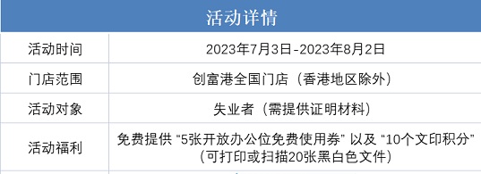 值得注意的是,該活動在提供免費辦公位的同時,還將附贈10個文印積分,可在創(chuàng)富港門店中打印或掃描20張黑白文件,該舉措也為用戶提供持續(xù)的便利和溫暖。