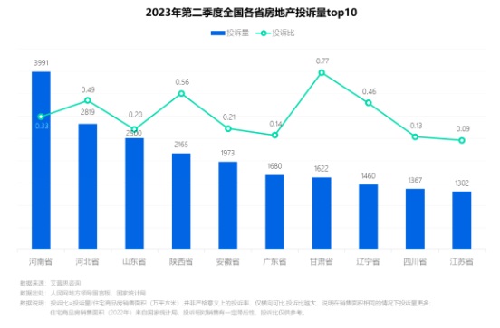 從地域分布來看,2023年第二季度河南省、河北省、山東省、陜西省、安徽省投訴量居前五,其中陜西省房地產(chǎn)投訴量較去年同期下降28.85%。