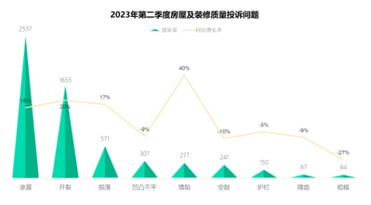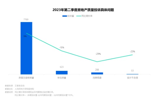 2023年第二季度,質(zhì)量投訴中房屋及裝修質(zhì)量相關(guān)投訴7769起,較去年同期增長(zhǎng)9%;車位質(zhì)量相關(guān)投訴523起,較去年同期下降15%;違章搭建、設(shè)計(jì)不合理相關(guān)投訴分別為288起、53起。