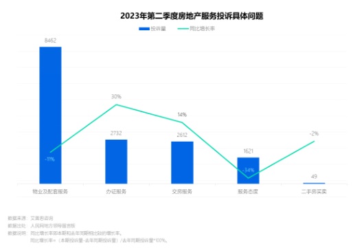 服務(wù)類投訴中,物業(yè)及配套服務(wù)投訴量8462起,較去年同期下降11%,其中物業(yè)不作為、亂收費(fèi)、亂使用維修基金等問題投訴較多;辦證服務(wù)投訴量2732起,較去年同期增長(zhǎng)30%,主要投訴問題為無法辦理房產(chǎn)證;交房服務(wù)投訴2612起,較去年同期增長(zhǎng)14%,主要涉及延期交房;服務(wù)態(tài)度相關(guān)投訴1621起,較去年同期下降34%,工作人員辦事推脫、拖延相關(guān)投訴較多。