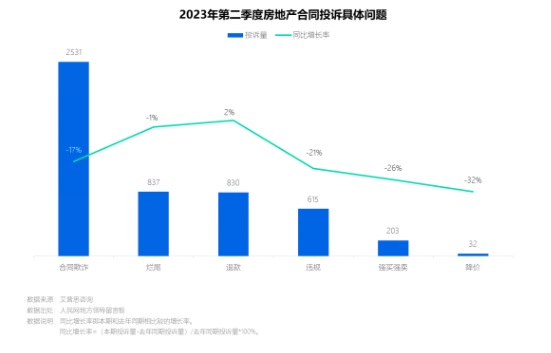2023年第二季度,合同類投訴中合同欺詐投訴量2531起,較去年同期下降17%,主要涉及面積縮水、虛假宣傳等問題;爛尾投訴837起,較去年同期下降1%;退款投訴830起,較去年同期增長(zhǎng)2%。違規(guī)、強(qiáng)買強(qiáng)賣、降價(jià)相關(guān)投訴較去年同期分別下降21%、26%、32%。