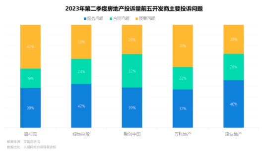 從投訴分類來看,2023年第二季度綠地控股、建業(yè)地產(chǎn)服務(wù)問題居多,占比均在40%以上;碧桂園、萬科地產(chǎn)質(zhì)量投訴較多,占比分別為42%、41%。