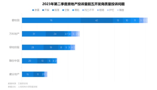 2023年第二季度,投訴量前五開發(fā)商質(zhì)量投訴具體問題中,滲漏、開裂仍為主要問題,碧桂園收到滲漏相關(guān)投訴76起、開裂相關(guān)投訴42起;萬科地產(chǎn)收到的滲漏、開裂相關(guān)投訴分別為31起、24起;綠地控股收到的滲漏、開裂相關(guān)投訴分別為28起、19起。