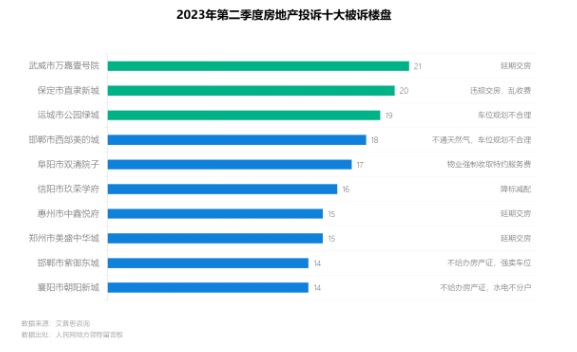 2023年第二季度被投訴最多的樓盤為武威市萬嘉壹號(hào)院,共收到投訴21起,主要投訴問題為延期交房。