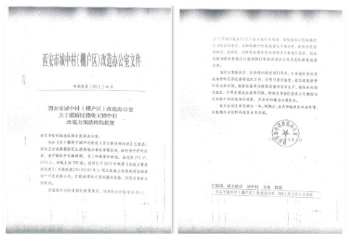 據(jù)葛林給記者提供的資料顯示,后在2010年,宏潤地產(chǎn)和穆將王商貿(mào)有限公司(原穆將王村委會無形改造后成立的集體企業(yè))簽訂了《穆將王城中村改造聯(lián)合開發(fā)合同修訂協(xié)議書》,將2008年1月批復的城改綜合用地297.6畝調(diào)整為420畝;原合同約定的18萬平方米的安置用房調(diào)整為地上13萬平方米住宅用房和地上2萬平方米的獨立商業(yè)用房;同時將原合同約定的2500萬元拆遷補償款調(diào)整為1.4億元,后報請西安市城改辦審核。2011年3月,西安市城改辦下發(fā)了市城改發(fā)〔2011〕44號《關(guān)于灞橋區(qū)穆將王村城中村改造方案結(jié)轉(zhuǎn)的批復》,同意將綜合改造用地調(diào)整為420畝。葛林向記者出示了2008年城中村改造實施方案批復和2011年城改方案結(jié)轉(zhuǎn)批復。