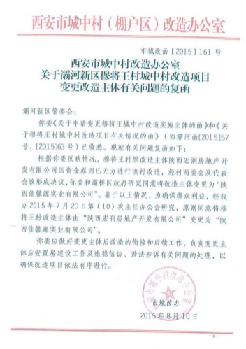 (西安市城改辦下發(fā)的《關(guān)于灞河新區(qū)穆將王村城中村改造項目變更改造主體有關(guān)問題的復函》)