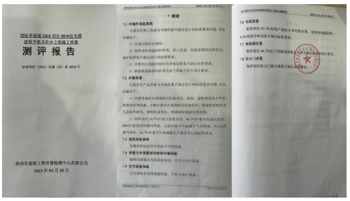 記者查閱到一份由陜西省建筑工程質(zhì)量檢測中心有限公司出具的編號陜建筑(2023)技服(政)第0010號的《測評報告》。報告顯示,DK8所建4棟樓房的房屋外墻、門窗、消防設施及所使用的電線電纜、水暖工程等均為不合格工程,使用的材料均為不合格和不達標的材料。