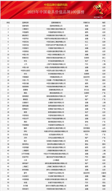 近日,2023年中國最具價值品牌100強(qiáng)排行榜發(fā)布,這是中國品牌價值研究院對我國品牌建設(shè)、未來發(fā)展?jié)摿熬C合市場競爭力進(jìn)行全面、科學(xué)、獨立的品牌價值發(fā)展調(diào)查研究宣傳發(fā)布工作。通過對全國34個。▍^(qū)、市),共計3500個重點品牌,行業(yè)涉及汽車制造、房地產(chǎn)開發(fā)、醫(yī)藥生產(chǎn)、食品飲料、紡織服裝、金融IT、家具建材等38個行業(yè),進(jìn)行了數(shù)據(jù)采集研究,基于對財務(wù)分析、消費者行為分析和品牌占有率分析確定候選品牌,邀請100位企業(yè)高管、學(xué)者及官員對經(jīng)資格審核符合要求的品牌進(jìn)行評選,比照國際上通行的做法,主要根據(jù)企業(yè)近三年的主營收入、主營利潤、總資產(chǎn)、凈資產(chǎn)、研發(fā)投入、廣告投入等指標(biāo),推測品牌未來可能帶來的超額利潤,再結(jié)合行業(yè)特點、市場狀態(tài)、品牌市場地位、品牌歷史等因素,對候選品牌進(jìn)行綜合評分排出,并對部分候選品牌進(jìn)行實地拜訪,從中遴選出100家最具價值的品牌。在此基礎(chǔ)上通過與全球品牌500強(qiáng)進(jìn)行綜合對比分析,進(jìn)而有針對性地提出促進(jìn)中國品牌做強(qiáng)做大做久的對策建議,在全國范圍內(nèi)形成了巨大的社會影響力。