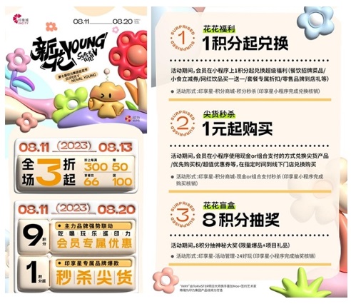 本屆花花節(jié),印力為全國會(huì)員實(shí)現(xiàn)精準(zhǔn)營銷和福利發(fā)放:「全場3折起」活動(dòng),「花花滿額贈(zèng)」折上每滿300贈(zèng)50,「花花隨心團(tuán)」餐飲66團(tuán)100等優(yōu)惠。并設(shè)置印享星會(huì)員專享花花節(jié)特別福利:1積分起兌超級(jí)會(huì)員福利、1元起秒殺尖貨、8積分抽大牌好禮。集團(tuán)聯(lián)動(dòng)榮耀、六福、全棉時(shí)代、瑞幸、麥當(dāng)勞、沃爾瑪?shù)却笈,定制花花?jié)專屬福利。