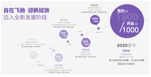 2016年初,麗楓酒店開業(yè)門店破100,正式進入“百店時代”。僅一年時間,迅速沖破200家,簽約500+個項目。2018-2019年,麗楓酒店開業(yè)破650家,簽約項目超1300家;2020-2023年,麗楓酒店抵達“千店”里程碑,成為超3000萬人次出行的優(yōu)質(zhì)選擇。