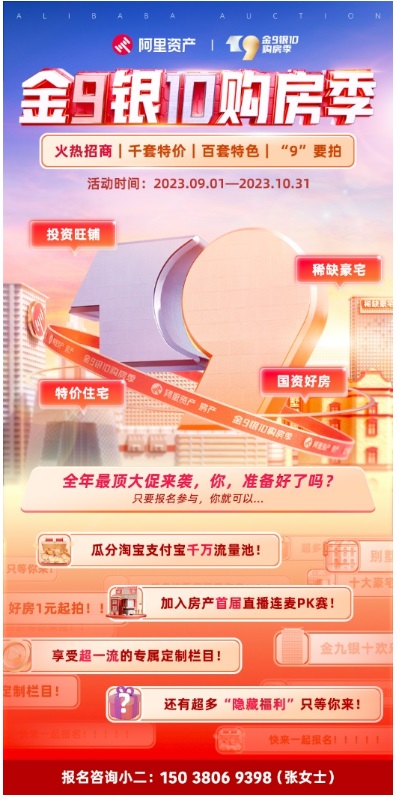 據(jù)悉,這個(gè)金九銀十大促,阿里資產(chǎn)將會(huì)有海量流量扶持以及營(yíng)銷助推,站內(nèi)多渠道、廣覆蓋,站外投放如微博、頭條、高德、支付寶、小紅書等,更有圖文、短視頻、直播以及各類熱門話題加持助推。大促貨源供給方向以獨(dú)家稀缺豪宅、專屬特價(jià)住宅、投資旺鋪、國(guó)資好房為主,特設(shè)優(yōu)質(zhì)欄目推廣,便于剛性和改善性住房需求消費(fèi)者和商鋪投資者更詳盡的了解和一鍵直達(dá)參拍。