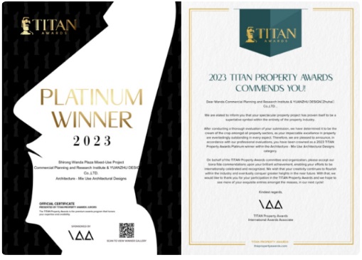 2023美國TITAN最佳商業(yè)綜合體建筑設(shè)計鉑金獎證書及獲獎函