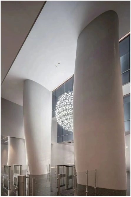 利用建筑結(jié)構(gòu)特點(diǎn),設(shè)計(jì)在橫向尺度有限的條件下大膽嘗試,盡可能的拓寬室內(nèi)空間的縱向尺度。結(jié)合裙樓天窗及鏡面天花材質(zhì),最終呈現(xiàn)出獨(dú)特的空間尺度和光影關(guān)系。細(xì)節(jié)部分采用數(shù)字化設(shè)計(jì)手段,結(jié)合廠(chǎng)家生產(chǎn)工藝?yán)枚嗲媸陌⒅男螒B(tài),將原有的常規(guī)建筑柱網(wǎng)打造成具有藝術(shù)美感的雕塑整列。
