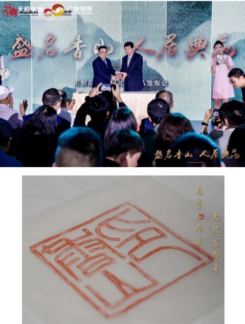 在發(fā)布會(huì)的高潮環(huán)節(jié),隨著篆刻大師張國(guó)維印香山雕刻莊重亮相,備受矚目的海淀四季青地塊案名終于揭曉——印香山。易勇、劉戍東兩位主要領(lǐng)導(dǎo)共同登臺(tái)為印香山項(xiàng)目聯(lián)合封印。