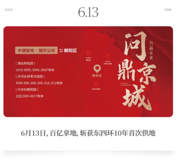 在東四環(huán)這個中國豪宅主場,10年未有新供地,此前大多是全球文化舶來、文化融合作品。正如所有偉大的開創(chuàng),都有一個不平凡的伏筆。大國文化自信,中建智地順應時代審美,精耕中國作品北京宸園,市場也給予了強大回響。回顧這123天,北京宸園展現(xiàn)了中建智地的操盤速度和實力:6月13日,百億拿地,斬獲東四環(huán)10年首次供地;