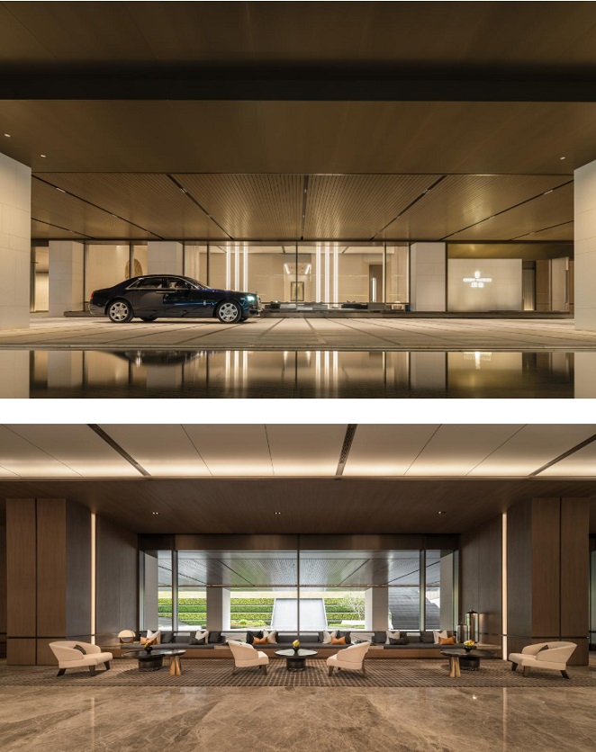 尊崇,從踏入璟喜的第一步開(kāi)啟。展廳級(jí)停車場(chǎng)與40米水景瀑布互通,將自然元素引入室內(nèi)。由SCDA打造的酒店式入戶大堂,采用簡(jiǎn)約溫暖的色調(diào)搭配天然木飾面與打磨成墻布效果的石材,柔和寧?kù)o。落地窗前,黑白與金棕系的落座區(qū)與下沉庭院的生態(tài)水景相映合,景觀更提取了建筑折面元素,加之水花流淌的形態(tài),張弛有度。