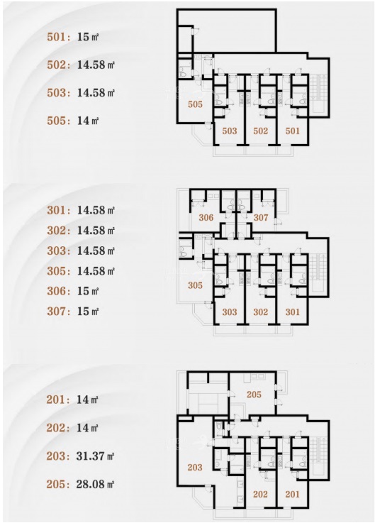 這里是全樓21戶的戶型圖,面積都不大,很多都在14-15平米,所以該項目最便宜的公寓單間,價格只要38萬人民幣。