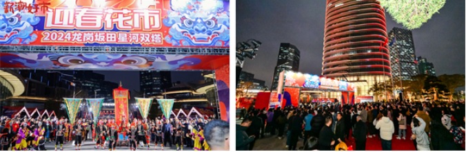 當(dāng)天,還舉行了隆重的亮燈儀式,在街道、銀行及企業(yè)、商家的共同見證下,星河雙子塔正式落成并隆重入市,星河WORLD迎春花市開幕、年貨一條街開幕、雅寶COCOPark夜市開幕!