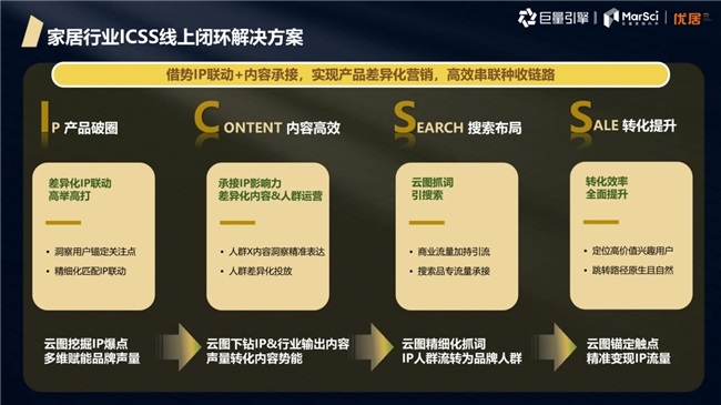 優(yōu)居提出的家居行業(yè)ICSS線上閉環(huán)解決方案,通過借勢IP聯(lián)動+內(nèi)容承接,實現(xiàn)產(chǎn)品差異化營銷,高效串聯(lián)種收鏈路。