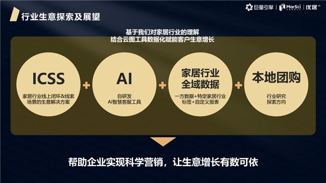 未來,優(yōu)居將基于對家居行業(yè)的理解和多年家居客戶服務(wù)經(jīng)驗,結(jié)合云圖工具數(shù)據(jù)化賦能,利用家居行業(yè)ICSS解決方案+AI智慧客服工具力量+家居行業(yè)全域數(shù)據(jù)+本地團購生意探索,幫助企業(yè)實現(xiàn)科學(xué)營銷,讓生意增長有數(shù)可依。