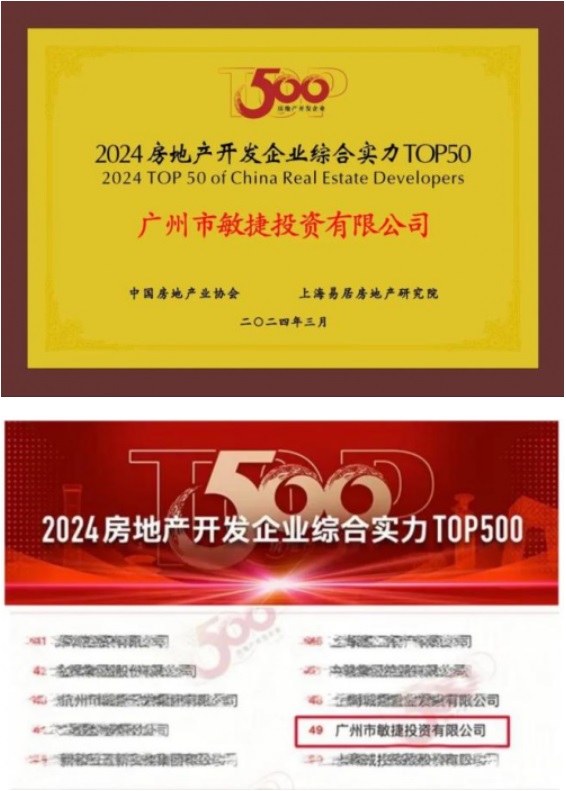 2024年3月20日,由中國房地產(chǎn)業(yè)協(xié)會、上海易居房地產(chǎn)研究院共同主辦的“新模式 新發(fā)展·中國房地產(chǎn)企業(yè)發(fā)展高峰論壇”在北京順利啟動;顒赢斕,“2024房地產(chǎn)開發(fā)企業(yè)綜合實力TOP500測評成果”榜單正式發(fā)布,敏捷集團憑借優(yōu)秀的企業(yè)綜合實力、穩(wěn)健的高質(zhì)量發(fā)展能力、良好的市場口碑等,榮膺“2024房地產(chǎn)開發(fā)企業(yè)綜合實力TOP50”第49位,這是敏捷集團首次躋身前50強,同時也是敏捷集團連續(xù)八年蟬聯(lián)“中國房地產(chǎn)開發(fā)企業(yè)100強”。