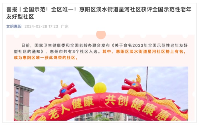 喜訊!國家衛(wèi)生健康委和全國老齡辦聯(lián)合發(fā)布《關(guān)于命名2023年全國示范性老年友好型社區(qū)的通知》,惠陽星河丹堤榜上有名,獲評全國示范老年友好型社區(qū) ,成為惠陽區(qū)唯一獲此殊榮的社區(qū),因此被地方媒體紛紛報(bào)道點(diǎn)贊。