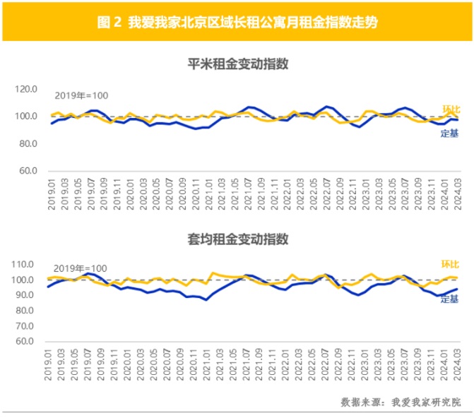 雖然,春節(jié)后北京租賃市場回升速度較快,但租金水平仍然保持平穩(wěn)。據(jù)我愛我家研究院數(shù)據(jù)顯示,一季度,整租交易中每平米平均租金環(huán)比微漲0.6%,同比下跌2.2%;每套平均租金環(huán)比微漲0.8%,同比下跌2.7%。今年一季度租金回升速度放緩,疊加去年四季度租金下行幅度略大,使得當(dāng)前租金水平仍未恢復(fù)至去年同期。不過,從各月度租金同環(huán)比波動來看,目前租金漲跌幅均保持在合理區(qū)間,顯示出市場的穩(wěn)定性和韌性。