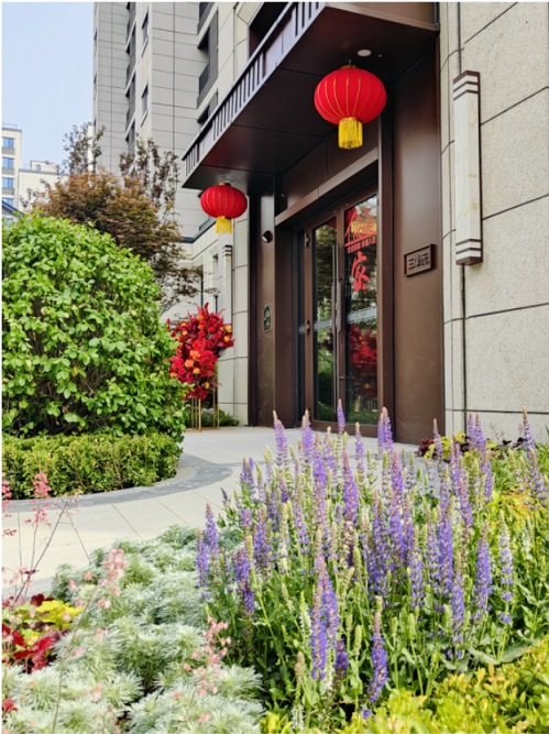 沿大門拾階而上,刷電子門禁穿門入園,入眼是一條數(shù)十米綠紅交映的海棠大道,大版面石材地磚鋪就既寬且直,大道兩側(cè)隊(duì)列著有10年樹齡的海棠成樹,拱然而立,枝繁、葉茂、花盛,鋪就一條陽光斑駁、碎香滿地的禮儀軸線,盡頭一株泰山迎客松,價值珍貴稀少,與一旁的山石造景相呼應(yīng),既是屏風(fēng),又賦予最尊貴的入戶儀式。
