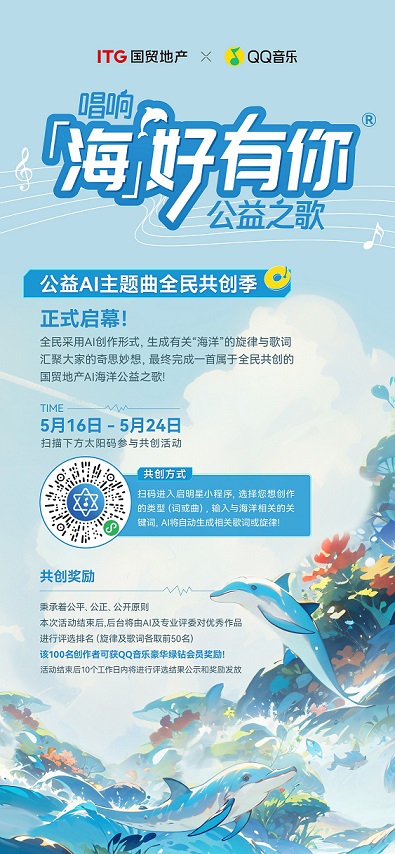 據悉,海洋公益AI歌曲征集產品頁已在5月16日正式上線,國貿地產AI海洋公益主題歌將于6月5日正式發(fā)布。透過本次活動,國貿地產旨在傳遞初心理念:海洋,是我們生命的起點,守護海洋,是人類初心的凝聚。