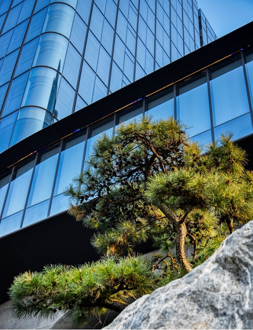 除此之外,麗金智地中心還于園區(qū)之內(nèi)打造了一處鬧中取靜的立體山水園林。項(xiàng)目自中國古代山水畫中汲取靈感,將現(xiàn)代詩意之美鐫刻在山水之境,最終呈現(xiàn)出的園林包含臺(tái)地、山石、水系、植被等豐富的元素,體現(xiàn)出東方特有的禪意韻味,搭配大堂框架式無肋大玻璃幕墻系統(tǒng),建筑內(nèi)外空間界限交錯(cuò),室外的山水美景引入大堂之中,為快節(jié)奏的辦公場所平添自然寫意點(diǎn)綴。