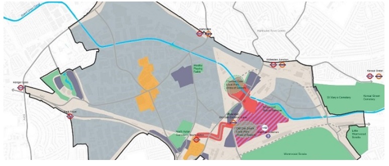 高密度的交通為區(qū)域發(fā)展打下堅(jiān)實(shí)基礎(chǔ)的同時(shí),倫敦最大的改造計(jì)劃也坐落于此。2015年,倫敦市長(zhǎng)批準(zhǔn)了Old Oak and Park Royal地區(qū)的規(guī)劃戰(zhàn)略。鑒于規(guī)劃的規(guī)模宏大,同年成立了專門的Old Oak and Park Royal Development Corporation(OPDC)來(lái)負(fù)責(zé)該地區(qū)的重建工作。2022年的OPDC《Local Plan》確立了從2018年到2038年的20年深度地區(qū)改造規(guī)劃。