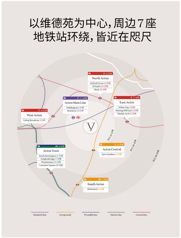 從維德苑啟程,僅需步行約2.2 公里,即可抵達(dá)皮卡迪利線與區(qū)域線交匯的Acton Town站,這里可以輕松抵達(dá)南肯辛頓(South Kensington)、騎士橋(Knightsbridge)、威斯敏斯特(Westminster)和萊斯特廣場(chǎng)(Leicester Square)等多個(gè)倫敦標(biāo)志性地點(diǎn);中央線與維德苑的聯(lián)系更加緊密,有3個(gè)站點(diǎn)緊靠維德苑,其中North Acton站只需步行1公里即可抵達(dá);距離最近的伊麗莎白線更是讓倫敦市中心和國(guó)際門戶都變得觸手可及,從維德苑出發(fā)只需步行不到1分鐘,便可以踏上的伊麗莎白線,6分鐘即可去到帕丁頓(Paddington),18分鐘可抵達(dá)希思羅機(jī)場(chǎng)。