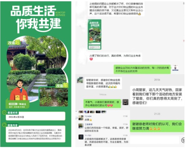 2023年,邦泰物業(yè)正式啟動品質(zhì)更新服務(wù)煥新1.0系列行動,從加強內(nèi)部管理出發(fā),實施了更為嚴(yán)格的質(zhì)量管控體系。通過制定詳細的服務(wù)標(biāo)準(zhǔn)和操作流程,確保每一項服務(wù)都能達到甚至超越業(yè)主的期望。在邦泰,一切業(yè)主報事的非正常閉單都將直接反饋到公司總經(jīng)理處,由總經(jīng)理親自督導(dǎo),直到妥善完成業(yè)主需求處理及反饋。而這一切都歸功于邦泰物業(yè)于2023全新建立的多渠道業(yè)主反饋機制,除了線上四大長效溝通機制建立,線下更是創(chuàng)新性提出“我家這一面墻”、“邦泰聽你說”等多項對客端服務(wù)觸點,確保業(yè)主需求第一時間響應(yīng)。