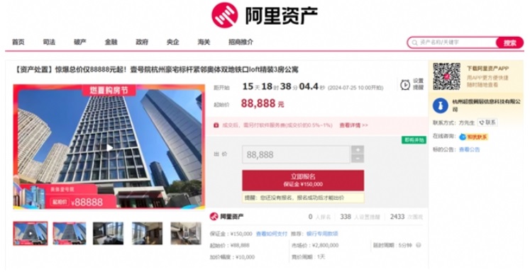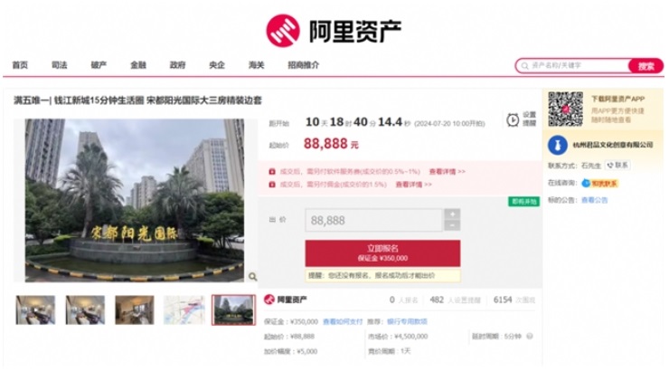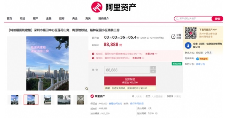 該標(biāo)的起拍價(jià)88888元,將于7月25日在阿里資產(chǎn)房產(chǎn)平臺開拍,參拍需繳納保證金6萬元,加價(jià)幅度為10000元或整倍數(shù)。