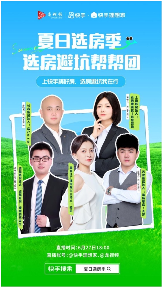 此次直播以夏日選房季活動為背景。6月,快手理想家聯(lián)動開發(fā)商、機(jī)構(gòu)和主播發(fā)起夏日選房季活動,為購房者帶來購房優(yōu)惠和優(yōu)質(zhì)房源。參與直播的四位房產(chǎn)主播分別來自長春、成都、天津、上海,遍布一線城市、新一線二線城市。