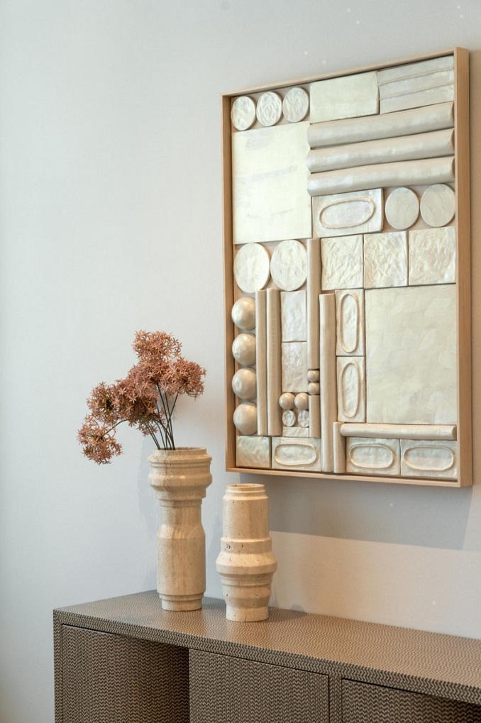 全屋結(jié)合奢石藝術(shù)和木質(zhì)溫暖,將自然材質(zhì)幻化為生活的敘事詩。電視背景墻以大理石巖板——“碧玉玲瓏”呈現(xiàn),宛如戲劇的幕布,觀影功能與生活美學兼具。在這里,藝術(shù)是空氣,是水,亦是生命——隨處可見的藝術(shù)掛畫呼應現(xiàn)代極簡格調(diào),日常中鏈接精神的愉悅。