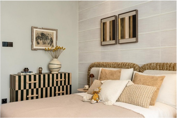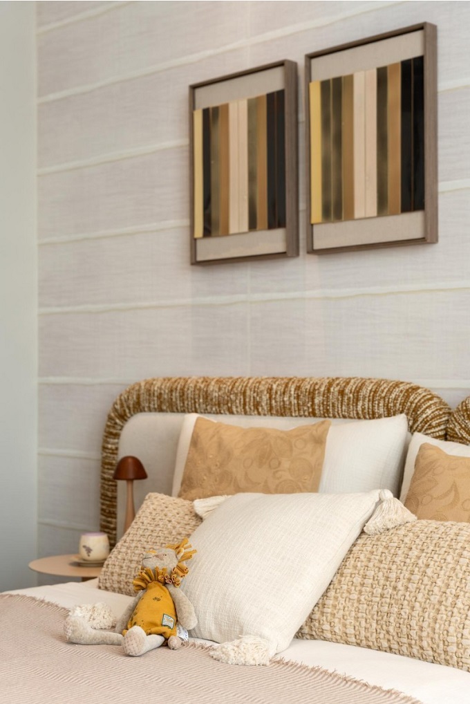 沉穩(wěn)的暖色基調(diào)賦予次臥雋永的情緒表達。日光自然流瀉,提升整個空間的明亮溫暖。藝術(shù)畫作、棉麻抱枕、小巧擺件……這些具有情感記憶的物件在方寸之間,讓人心生暖意。輕盈心境和精神留白在此間停泊,安放溫馨的生活向往。