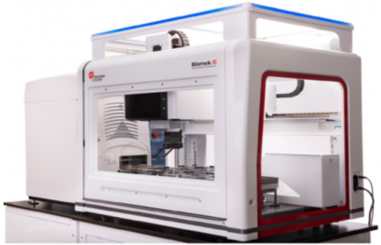 Biomek i7(H)雙臂自動(dòng)化工作站,整合進(jìn)Echo納升級(jí)聲波移液系統(tǒng)、高通量耗材供給站、高通量在線振蕩培養(yǎng)箱、高速冷凍離心機(jī)、SpectraMax酶標(biāo)儀、電動(dòng)PCR儀、封膜機(jī)、撕膜機(jī)、QPix微生物克隆篩選系統(tǒng),設(shè)備之間的連接以Biomek機(jī)械手、SCARA機(jī)械臂和軌道實(shí)現(xiàn),用以完成從分子克隆到蛋白篩選的全自動(dòng)化操作。