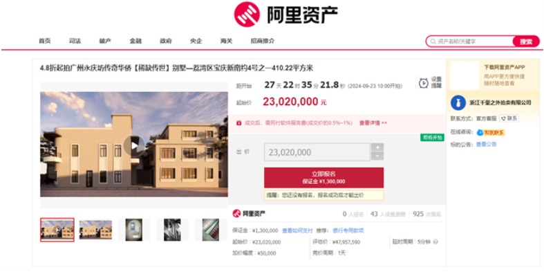 浙江千里之外拍賣有限公司將于2024年9月23日10時起至2024年9月24日10時止(按交易規(guī)則延時的除外)在阿里資產平臺上對廣州永慶坊傳奇華僑【稀缺傳世】別墅—荔灣區(qū)寶慶新南約4號之一進行公開競價活動。