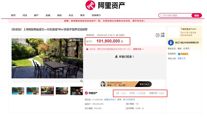在上海月光流域別墅的拍賣中,該資產吸引了眾多競買者的踴躍參與該棟別墅共引來21人報名,競買方你爭我搶,經過123輪競價;延時84次后,它的成交價比起拍價足足高出了8190萬元,溢價率達到409.5%。本次拍賣的保證金為2,000,000元,起拍價為20,000,000元,競價周期為 1 天,加價幅度為50,000元。在拍賣過程中,競爭十分激烈。最終,該資產以101,900,000元的價格成功拍出。并于8月初正式在上海阿里中心簽約過戶。