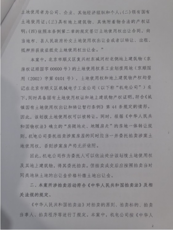 本案中,倘若拍賣標(biāo)的僅為案涉房屋,而不包括案涉土地使用權(quán),則王女士通過拍賣取得的案涉房屋將無所依附,該拍賣結(jié)果對買受人王女士毫無意義。根據(jù)《中華人民共和國物權(quán)法》的規(guī)定以及民法的一般原理,機電公司委托拍賣案涉房屋的同時應(yīng)當(dāng)一并委托拍賣案涉土地使用權(quán)。
