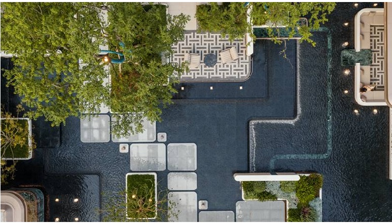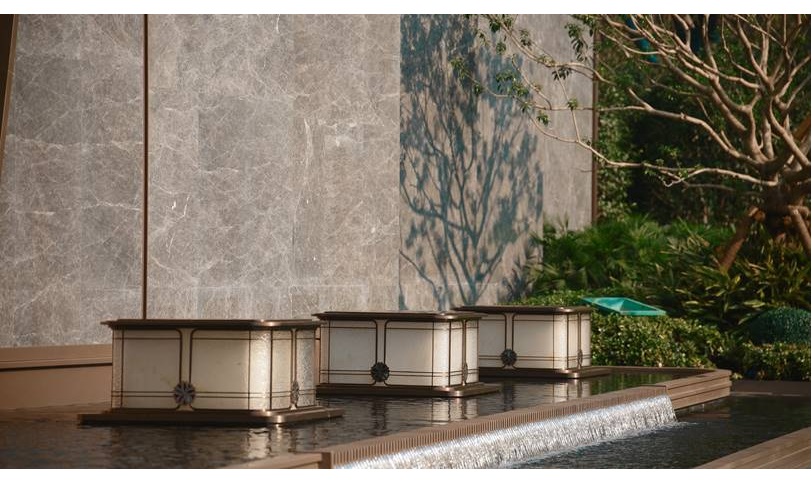 看細(xì)節(jié),大地沉淀歷久彌新的「永恒感」。摒棄常規(guī)的涂料與瓷磚,不惜成本采用多種臻稀石材,打造從建筑外立面到景觀園林的完整石材體系。從會所大堂的水刀拼花,到園林節(jié)點(diǎn)的奢石鋪裝,每一處細(xì)節(jié)都經(jīng)過多道工藝打磨,最終呈現(xiàn)堪比藝術(shù)館的質(zhì)感體驗(yàn)。